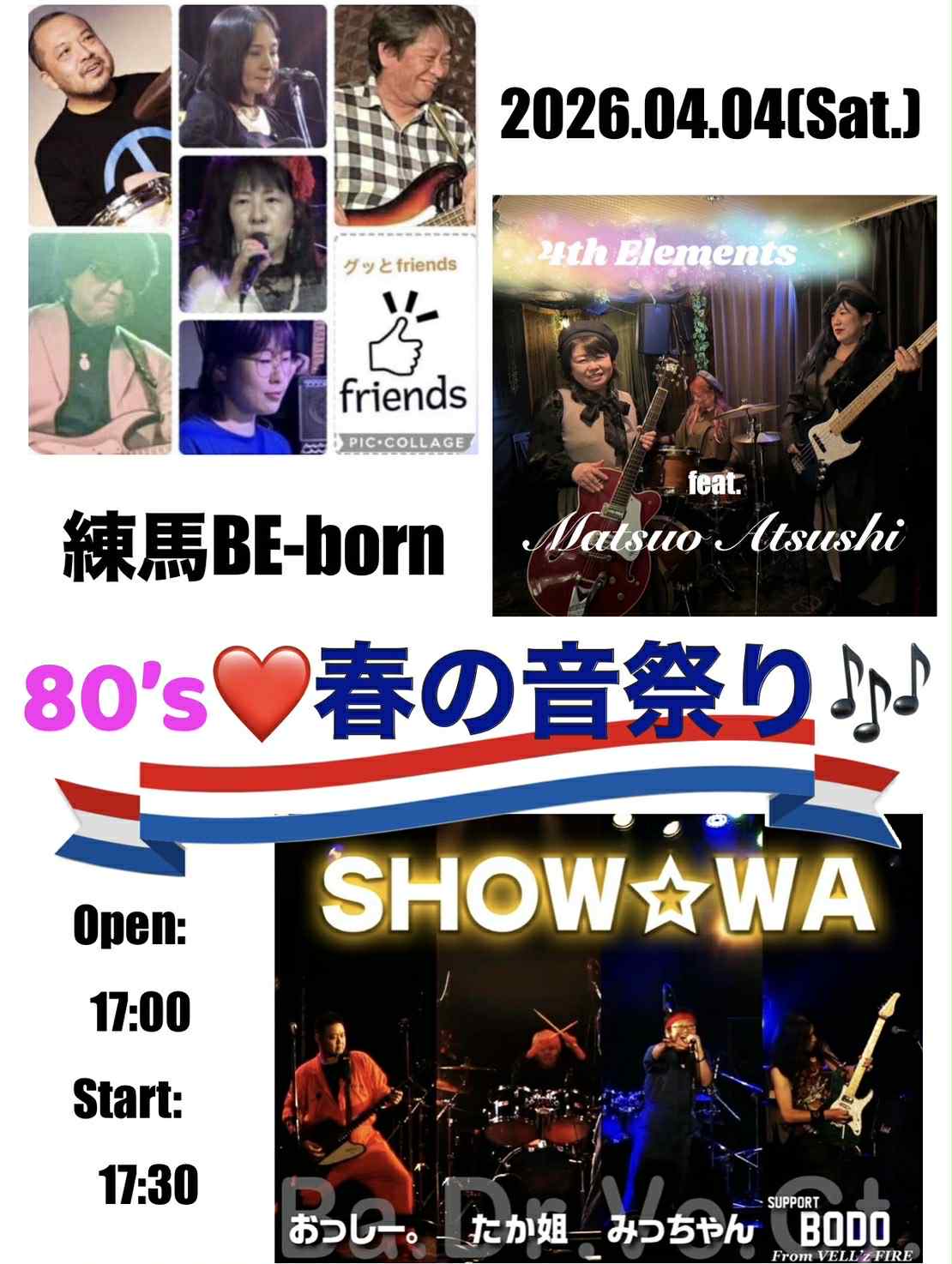 【80’s春の音祭り】  お気楽ライブバンド編乗っ取り企画 主催:SHEENA open 17:00 start 17:30 charge 2,000円 (1ドリンク付) 出演 ★17:30-18:10 4th Elements feat.MatsuoAtsusi ★18:30-19:10 グッとFriends ★19:30-20:10 SHOW☆WA 20:30 close