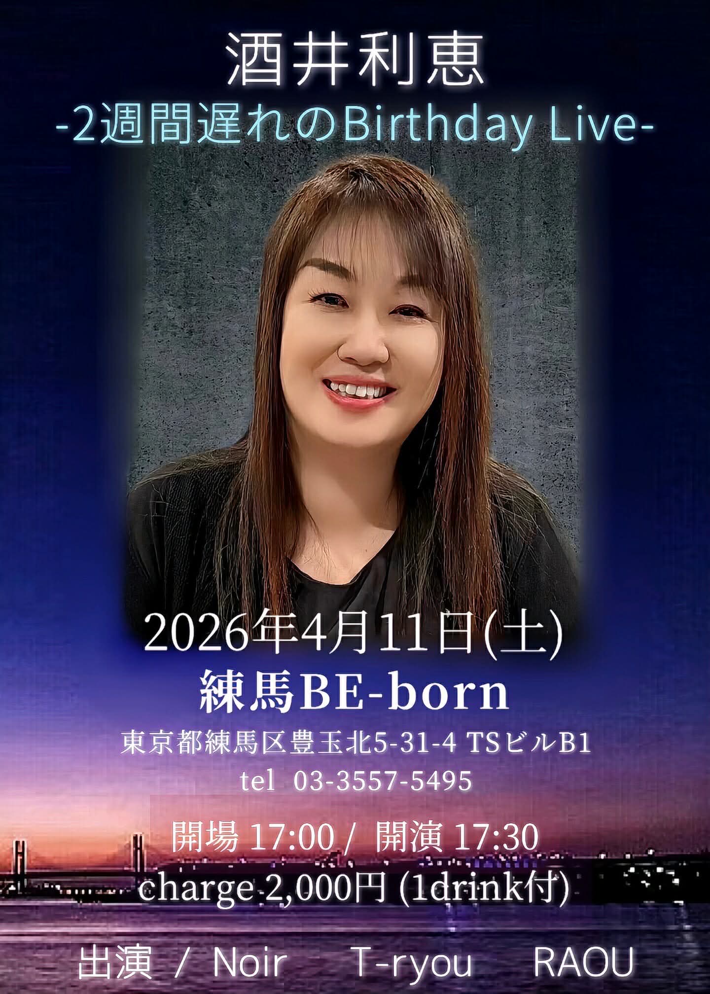 【酒井利恵2週間遅れのバ一スデ一ライブ⭐】  お気楽ライブバンド編のっとり企画 主催:酒井 様 open 17:00 start 17:30 charge 2,000円 (1ドリンク付) 出演 ★17:30-18:10 Noir ★18:30-19:10 T-ryou ★19:30-20:10 RAOU 20:30 close