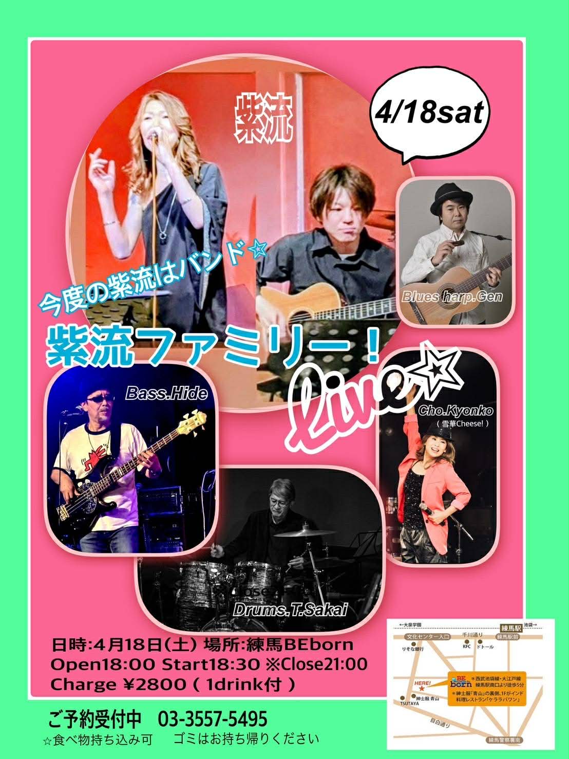 【紫流ファミリーLIVE!】  open 18:00 start 18:30 charge 2,800円 (1ドリンク付) ★18:30-19:15 紫流、Gen. さいもん、 ★19:30-20:30 紫流ファミリー 21:00終了