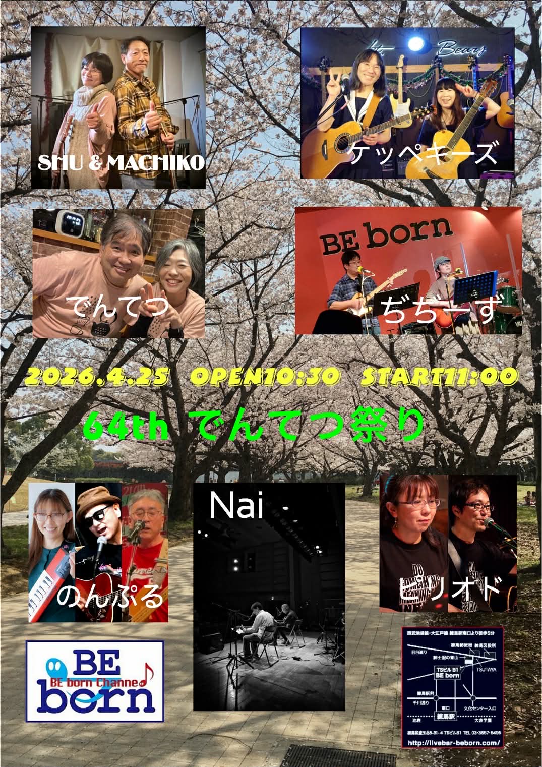 【でんてつ祭りVOL.64】  open 10:30 start 11:00 charge 2,000円 (1ドリンク付) ★11:00-11:30 1. ぢぢーず ★11:45-12:15 2. SHU & MACHIKO ★12:30-13:00 3. ケッペキーズ ★13:15-13:45 4. のんぷる ★14:00-14:30 5. nai ★14:45-15:15 6. ピリオド ★15:30-16:00 7. でんてつ